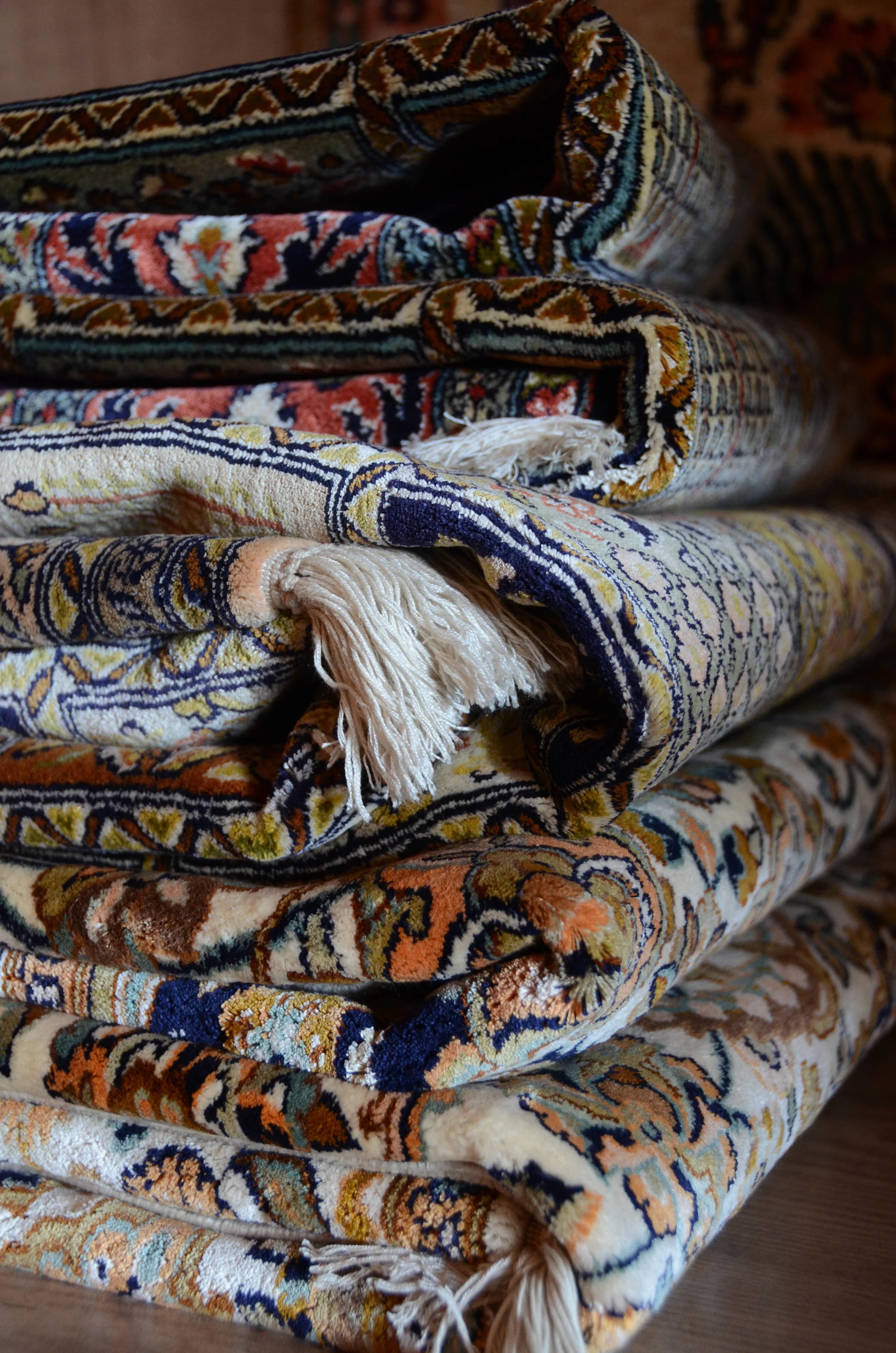 It takes a community to build a carpet in Kashmir. Over as long as a decade, a carpet will move from family to family, each one an expert in their task. It starts with the silk suppliers, dyers and spinners, and moves to the weaver for several years. Once the weaver is finished, it goes to the washers, trimmers and binders. Finally, it shows up here at A Silk Addiction. Every carpet we carry is hand woven from 100% silk thread tied on a silk or cotton foundation on home-made looms in Kashmir.