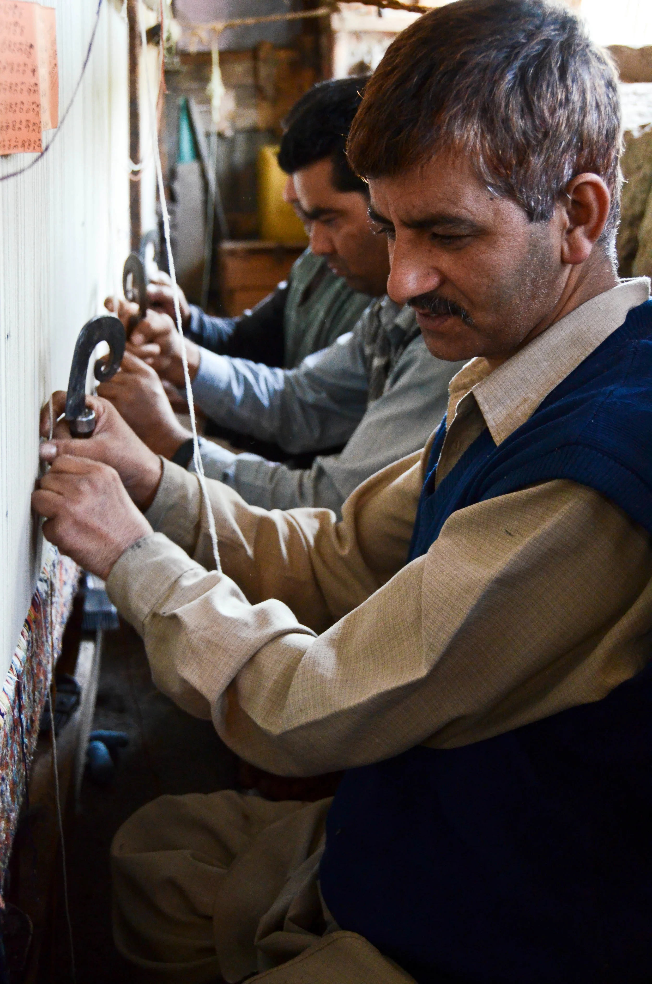 Once the row is finished, they lay in a locking thread and hammer it tight with a special comb to hold the knots in place. Repairing any mistakes they might have made in the previous row is no longer feasible, so they have to get each knot right the first time. It's fine work that demands focus and attention. As the best light of the day fades, they turn their meditations to the more conventional carpets that form the bread and butter of their individual work.