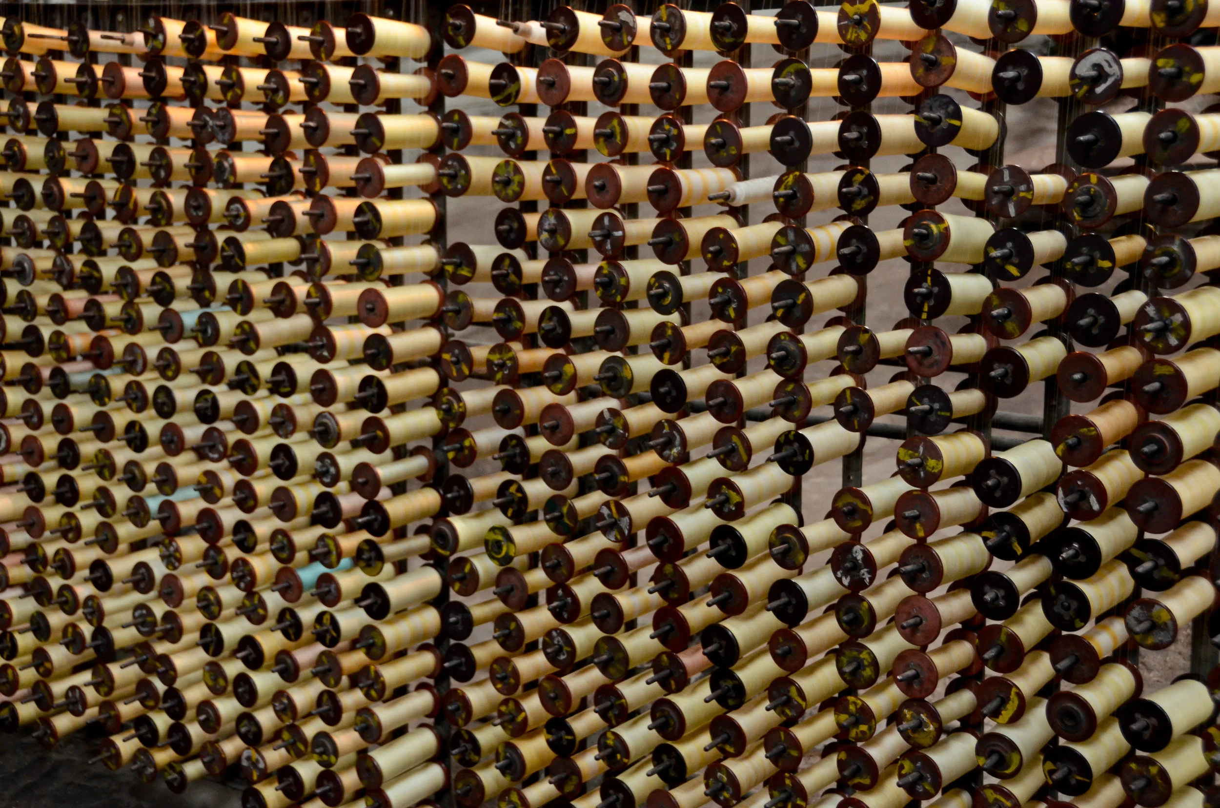 Spools of silk at the government factory in Srinagar ready to load onto the sari looms.
